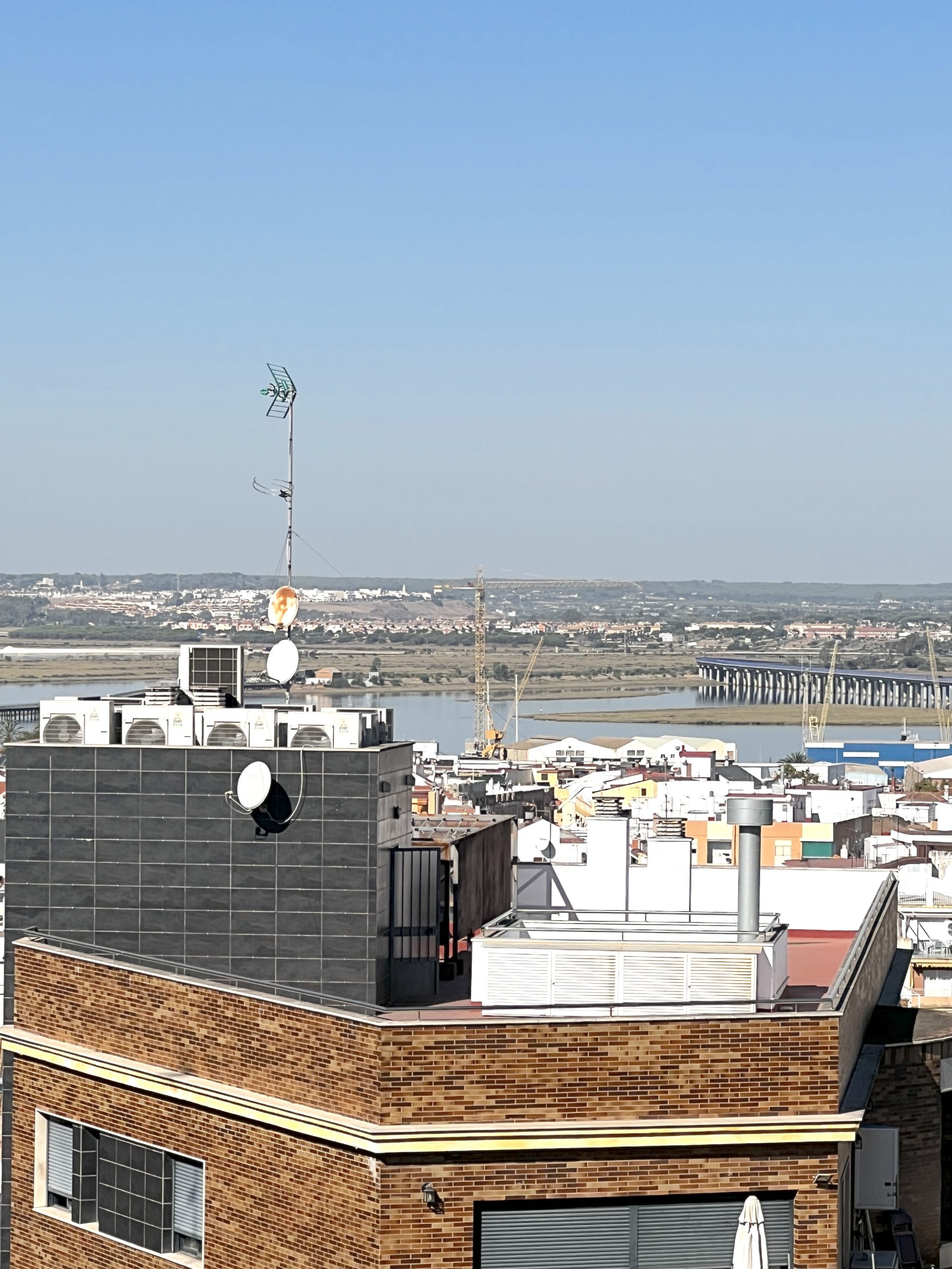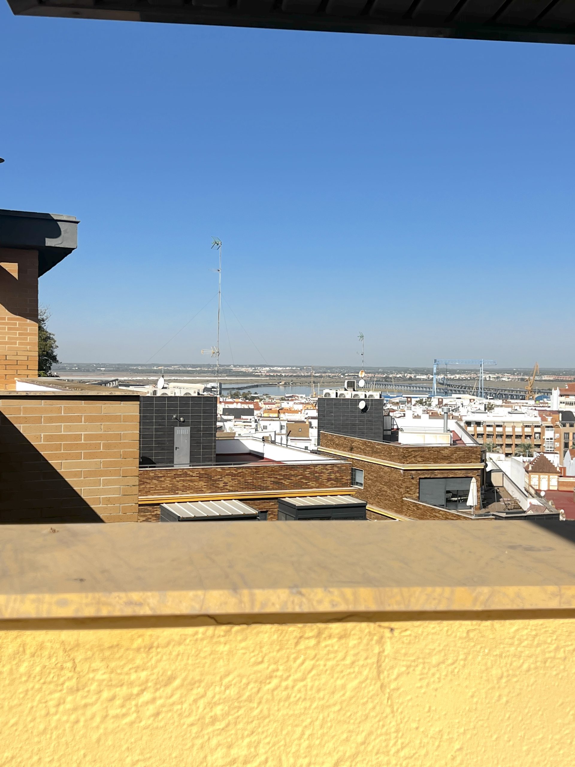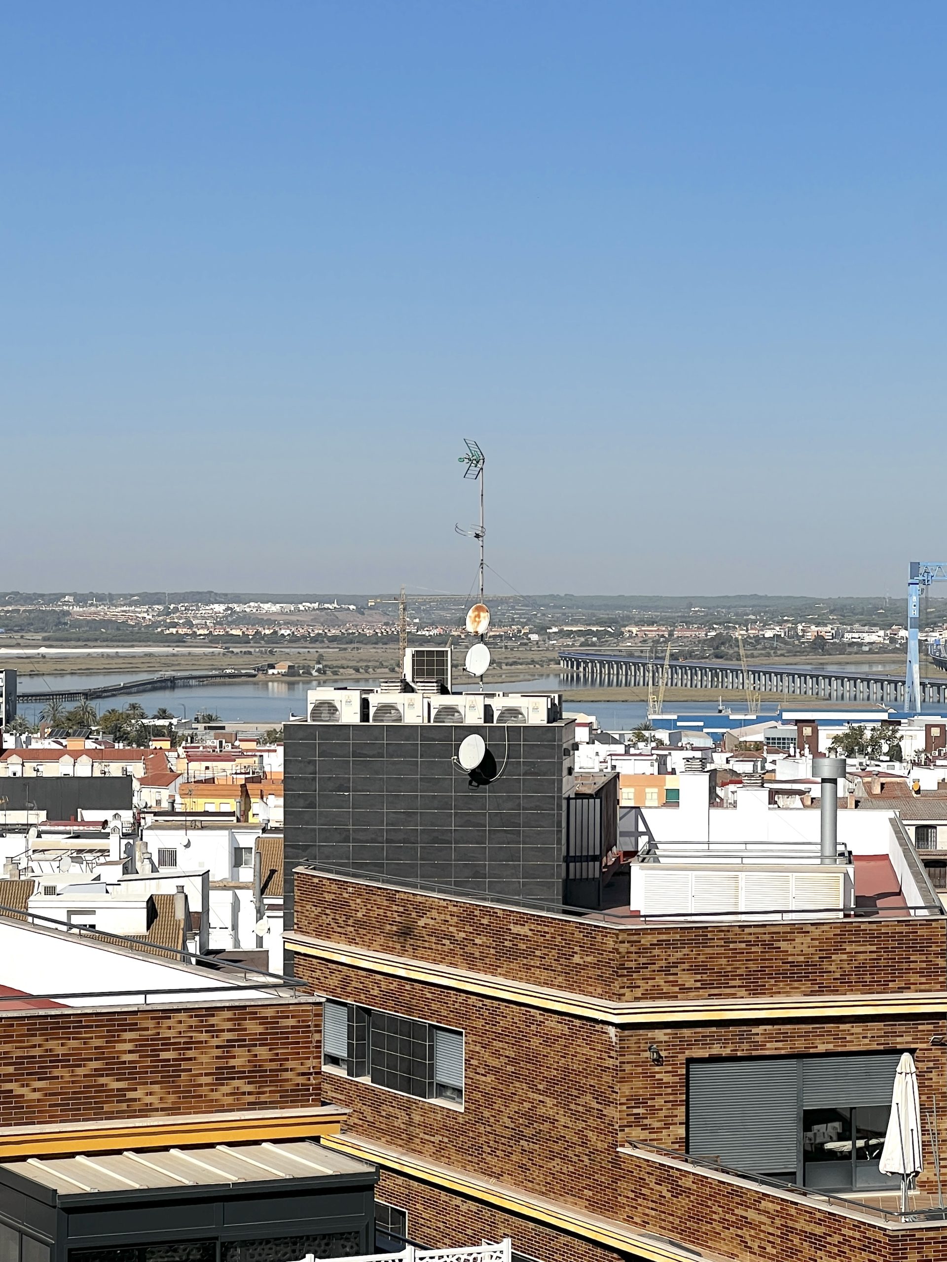 La vivienda destaca por su impresionante terraza tipo ático con espectaculares vistas panorámicas a la Ría de Huelva, vistas que también se disfrutan desde ambos dormitorios y desde el salón. El salón, amplio y luminoso, cuenta con espacios diferenciados para zona de descanso y comedor, con acceso directo a la terraza, creando un ambiente perfecto para disfrutar del exterior y de las vistas.