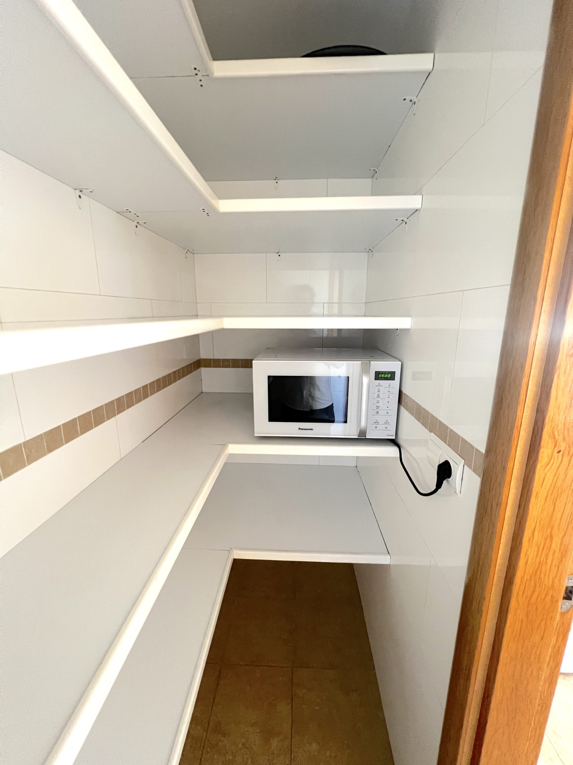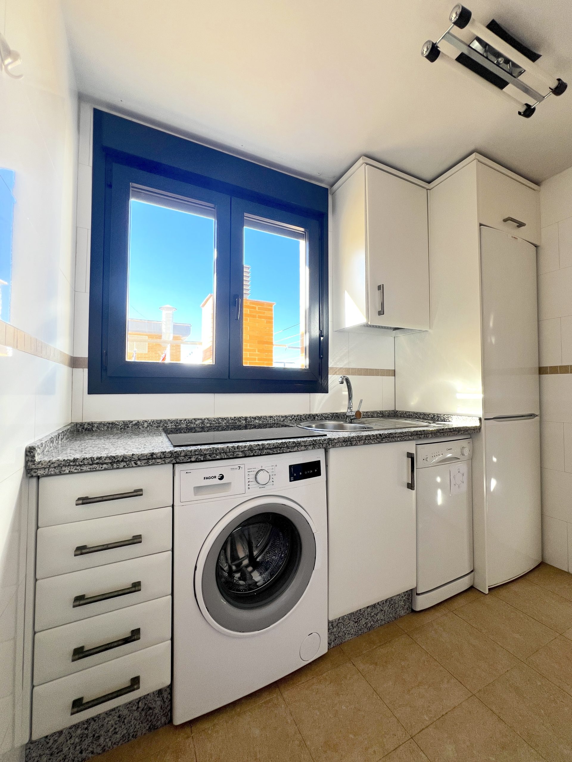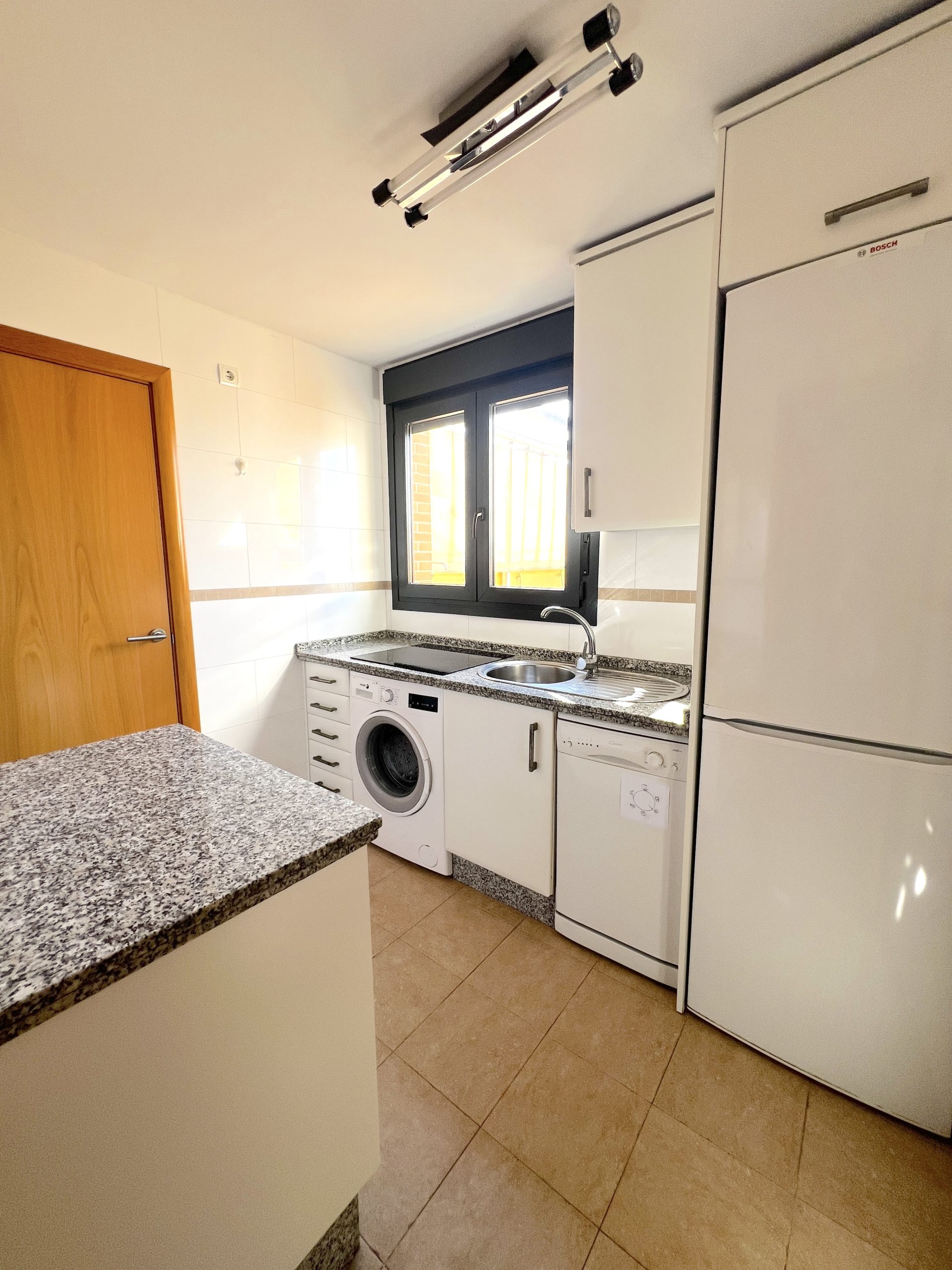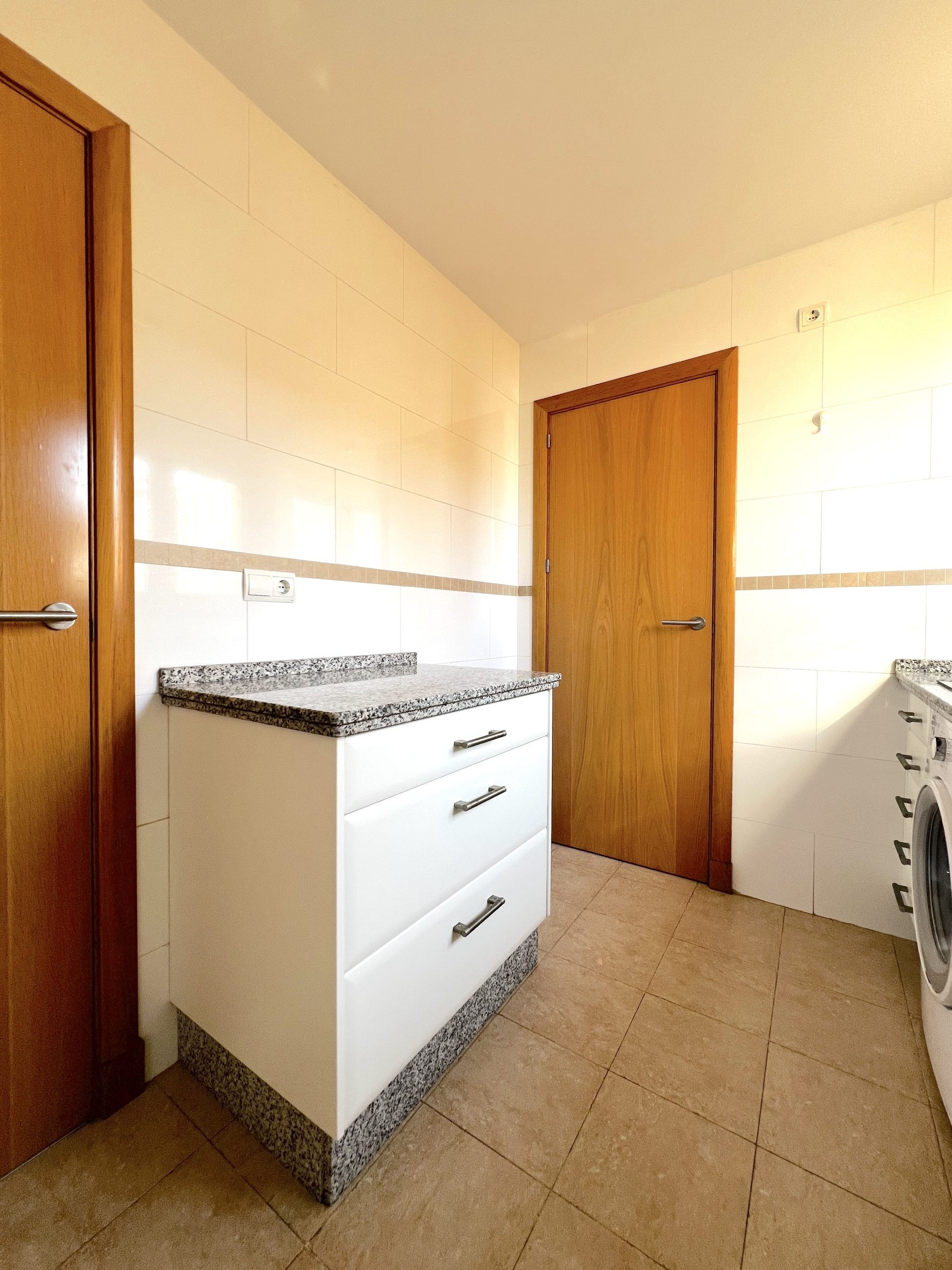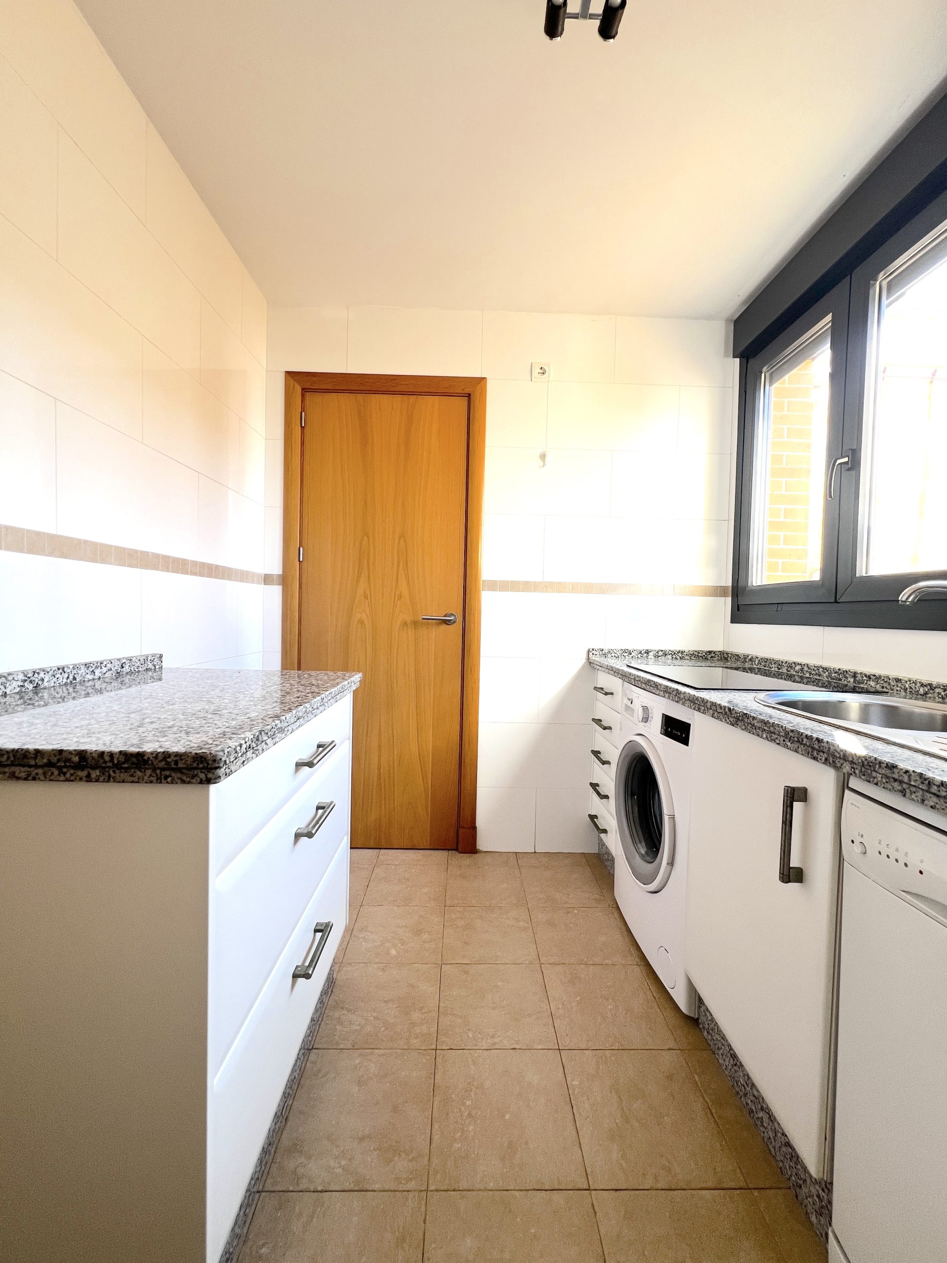 La cocina, funcional y bien distribuida, dispone de acceso a una gran despensa, ideal para almacenamiento adicional. El baño, amplio y elegante, incorpora bañera de hidromasaje para tu confort.